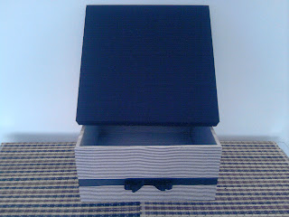 Uma linda caixa toda forrada em tecido listrado azul e branco.
